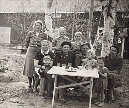 Grupp på gårdsfest i Kuni. Fr. v. Elvi Forsman, Irene Forsman, Rune Forsman, Gunilla Forsman g. Rabb, Signe Lustig, Anna-Lisa Forsman g. Vasberg, Elvi Wasberg, Margareta Wasberg g. Svanfors, Eva Forsman g. Lax och Jenny Forsman.