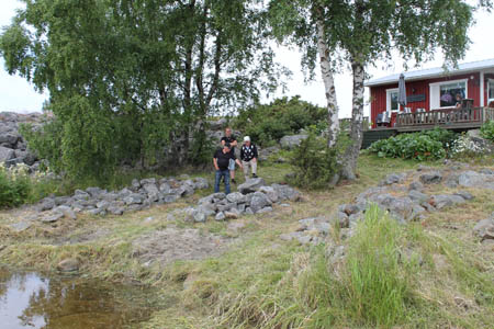Alf Hellman visar var Vassorborna drog upp sina båtar då de låg i fiske på Aspskärsgrundet. Kenneth Hellman och Rudolf Östman betraktar hamnplatsen. Stugan är Alf Hellmans.