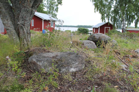 Vassorbornas (Jakob Örns) fiskestuga på Aspskärsgrundet. Stugans hörnsten visar var den stått. I bakgrunden Kenneth Hellmans stuga.