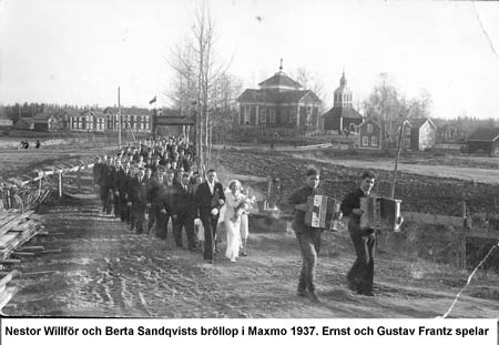 Nestor Willför och Berta Sandqvists bröllop i Maxmo, Ernst Frantz (t. v.) och Gustav Frantz spelar. I bakgrunden Kaggs gård t. v. och Öling t. h.