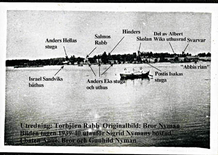 Bilden är tagen 1939–40 från Sigrid Nymans stuga mot Lillöskatan. I båten sitter Anne Nyman, Bror Myman, och Gunhild Nyman. Utredning av byggnader, Torbjörn Rabb