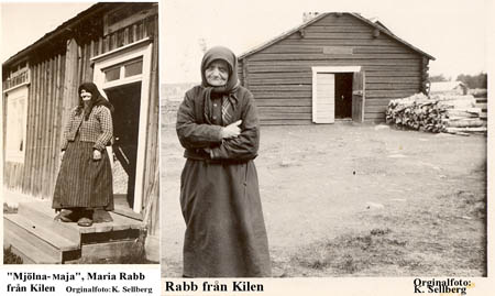 ”Mjöölna Majja”, Maria Rabb från Kilen ( 1859 – 1944). Hennes far var mjölnare på kvarnen i Kilsbäck. Mjölna-Maja framför Wickströms stuga i Vassor. På den andra bilden ser vi smedjan i bakgrunden.