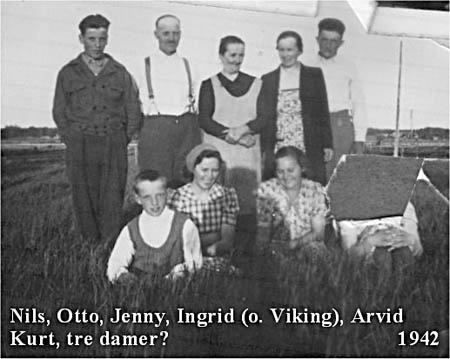 Nils Östman, Otto Östman, Jenny Östman f. Fors, Ingrid Åberg f. Östman, Arvid Åberg. Sittande: Kurt Östman, Alice Östman g. Södergård och Rakel Henriksson g. Granholm i Kvimo.