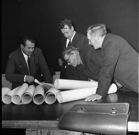 Med nyskifteskartor. Från vänster: Kartograf Kalevi Vesterinen, ingenjör Johannes Simons, bonden Einar Nyman och bonden John Rabb.