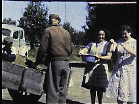 Arne Rabb (Norribyn) säljer fisk. Etel Frantz till vänster, Hilma Frantz (f. Sticksund i Koskö) till höger