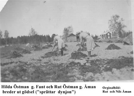 Hilda Östman g. Fant och Rut Östman f. Åman breder dynga på hemgården Karl Östmans mark på Norrstu (Lövis).