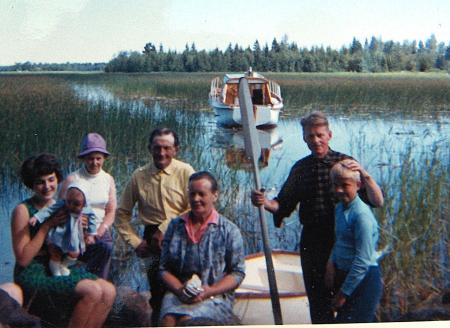 Toivo Kultti med sin stora motorbåt i Sildishamnen. Fr. v. Vivan Wik med Anne-Marie Wik, Wivi Kultti, Arvid Åberg, Ingrid Åberg, Toivo och Arne Kultti.