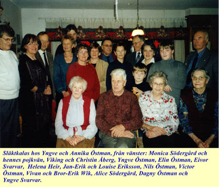 Släkten Östman på släktträff hos Yngve Östman och Annika Östman. Längst fram: Elin Östman, Nils Östman, Alice Södergård och Dagny Östman. Övriga: Monica Södergård, Viking Åberg, Christin Åberg, Yngve Östman, Eivor Svarvar, Helena Heir, Jan Erik Eriksson, Louise Eriksson, Viktor Östman, Bror Erik Wik, Vivan Wik, Martin Östman och Yngve Svarvar. Namn i bilden