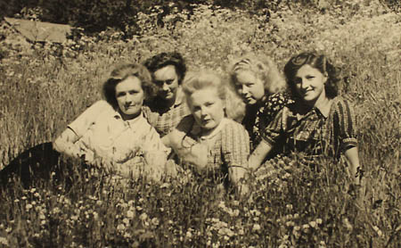 Kuni skofabriks personal i juni 1943. Aina Grop f. Wahlström, Ellen Finne från Mattasviken, Oline Wik, g. Örn, Heli Koivisto och Rut Studd.