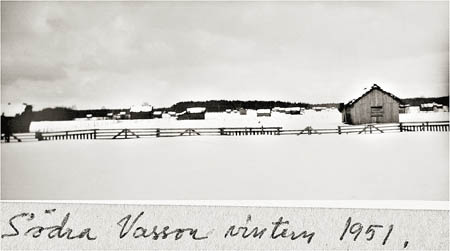 Södra Vassor, Storkroken och del av Åkersidan. Från vänster: Anders Beijars åkerskifte med lador, Mickel Strandbergs lada med tillbyggt vallfähus till vänster, Viktor Svarvars brädlada av större modell, Nytomts vallfähus, Albert Wiks lador i rad till Krokbacken och Åbergs lador. I förgrunden Arvid Strandbergs lada med tillbyggt vallfähus. Längst till höger Ernst Frantz lada med tillbyggt vallfähus. Harry och Gunhild Wik byggde i samband med nyskiftet 1967 sin gård på högra sidan om Mickel Strandbergs vallfähus och lada. Närmast kameran ser vi det staketliknande snöhindret. Tanken var att drivsnön skulle lägga sig på läsidan om snöhindret och inte driva igen vägen.