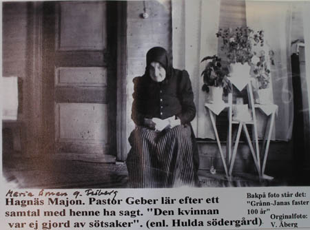 Maria Friberg f. Åman (på Grånnbacken) ”Haagnäs Majjon” blev 100 år och tog hand om sin föräldralösa systerson Jonas Näsman. Text i bilden.