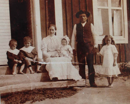 Rafael Åberg, Arvid Åberg, Maria Åberg, Sigrid Åberg, Johannes Åberg och Gerda Åberg på trappan vid Åbergs