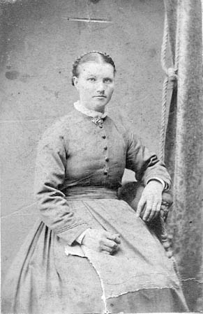 Johanna Kuni 1857-1939 som ung. Senare kallad ”Skata-Mosson”. Hon var känd för sin handlingskraft, född vid Herrgos och gift 1878 med Johan Kuni. (Härrgos.)