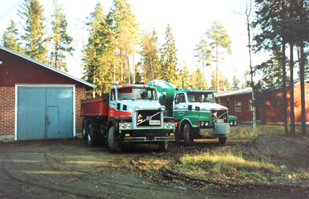 Joel Fribergs sista bil till vänster och Johnny Fribergs Volvo lastbil till höger, framför Gösta Kunis garage i Kuni. Johnny körde med egen bil betong åt Lohja Rudus bl.a. till motorvägsbygget och Replotbron. Betongroterare kunde lyftas bort och ersättas med ett flak för gruskörning.
