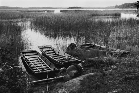 Tre ökstockar vid strand på Brändholmens norra del 1982. Den t. v. tillhör Alvar Finne och den i mitten Arthur Ståhlberg. I båtarna finns inga åror men flera forkar och obbar. Landet till höger är Björnholmen och holmen mitt i bilden är Björnholms norrevet.