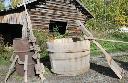 Årklykor till ökstocken, fatet där Lennart Hellman värmde stenkolstjäran för att impregnera skötar och stängarmar, ett saltkar (4 stycken fanns i sjöboden ca 1, 2 m i diameter), en stång som märkte ut fiskeredskap (korkar höll stången med flaggan upprätt), ändan på en fork och ett roder till motorbåten.