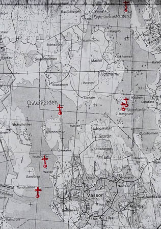 Kungsåderns märken från 1911 enligt Yngve Svarvar (ett märke finns också norr på Mälsorlandet). Korsformade farledsmärken. Det finns flera märken i Kvevlax hembygdsförenings arkiv. Läs mera...