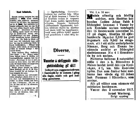 Kuni folkskola invigning WP 6.10.1915. Suggasmotorkvarn WP 1911. Ollus Rabb styckning Vbl 5.9.12. Anders Johan Rabb auktion WP 1917