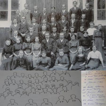 Skriftskola i Maxmo 1. Karl Heir, 2. Hugo Sandvik, 5. Arvid Fors (f. Frantz), 10. Oskar Häggström, 15. Johannes Wik (Vikén), 24. Berta Sjöberg, 25. Anna Frantz, 27. Johanna Mörk, 32. ?, 34. Elsa Hellman, 38. Anna Frantzén. Konfirmander