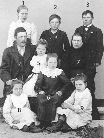 1. Olga Berg g. Bäck, 2. Evert Berg, 3. August Berg, 4. Isak Berg, 5. Ellen Berg, 6. Ida Berg, 7. Maria Berg, 8 Edit Berg g. Nygård och 9. Aina Berg g. Forsén. Bodde på Sundbacken.