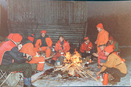 Älgjakten, samling 1978 på Mälsor vid gamla slakteriet. Fr. v. Ole Beijar, ?, ?, Per-Olof Forsén, Kari Koivisto, Ruben Studd, Alf Hellman, Stig Kastus, Elis Örn och Bernhard Wallén.