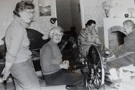 Ulla Wasberg följer med då hennes mor Irene Strandberg spinner och Hulda Södergård och Ellen Ståhl kardar på ett ”koådankalas” hos Margareta Nikus.