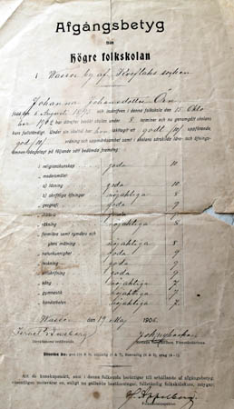 Avgågsbetyg för Johanna Örn f. 1893 på ”Jossasbackan” (Väster om Beijars gård), gift Södergård i Kunisundet.