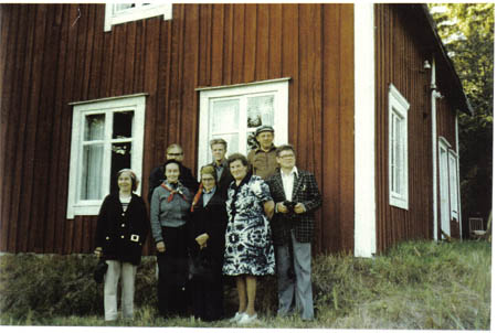 Isak Erik Finnes stuga i Mattasviken. (Sid 103 i VBH III). Fr. v. främre raden Hulda Nylund, Ellen Björk, Ida Virtanen, Verna Finne och Nils Nylund. Bakre raden Kauko Virtanen, Bror Björk och Villiam Finne.