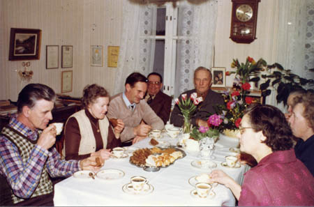 Uppvaktning, Ellen Rabb fyllde 80 år 1981. Fr. v. Nils Östman, Elin Östman, Kurt Östman, Erik Rabb, John Rabb, Ellen Rabb (något skymd), Aili Nabb och Dagny Östman.