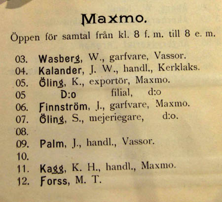 Wasa telefonkatalog 1903–1904 under Maxmo. Wilhelm Wasberg och Jakob Palm (Smedis-Marthagården). 1910 finns också Isak Nyman handlande i Wassor med telefoner via Maxmo.