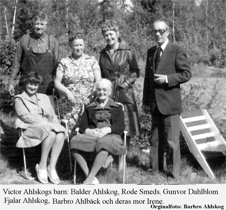 Victor Ahlskogs (Vassorlärarens) barn: Sittande: Barbro Ahlskog g. Ahlbäck och deras mor Irene Ahlskog f. Glasmästar. Bakom fr. v. Balder Ahlskog, Rode Ahlskog g. Smeds, Gunvor Ahlskog g. Dahlbom och Fjalar Ahlskog.