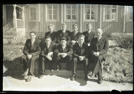 "Folkhögskolpojkar" 1953. Överst f.v. Edvin Vestergård (f. 1933, Vassor), Carl-Gustav Häggblad (f. 1935, Oravais), Åke Hinders (f. 1934, Kuni, Kvevlax), John Bäck (f. 1934, Brännars, Oravais). Nedre raden f. v. Skolans slöjdlärare Verner Nygård (f. 1907, Rökiö), Nils Granberg (f. 1935, Rökiö), Nils Sandström (f. 1935, Oravais), Karl Ehrström (f. 1935, Tuckor), agronomilärare Erland Ingves. Tid: 1953. Plats: Rökiö.