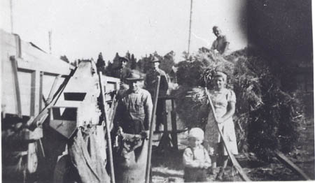 Tröskning i Kuni. Johannes Kuni, August Bäck, Emil Flinkfelt, Aili Herberts, Elvi Wasberg och Åke Forsman f. 1941.