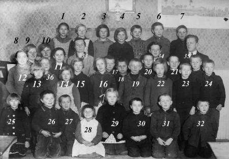 Kuni folkskola, Kuni folkskola 1932-33. Eleverna är födda mellan 1920 och 1926. 1. Märta Kuni (Södergård), 2. Alice Rådman (Martola), 3. Elin Pörn, 4. Elly Berg, 5. Elis Rådman, 6. Runar Berg, 7. Bertel Södergård, 9. Aili Kuni (Herberts), 10. Elvi Kuni (Wasberg), 11. Hulda Finne (Nylund), 12. Ellen Finne (Björk), 13. Elin Wahlström, 14 Doris Kuni, 15. Sally Rådman (Lassus), 16. Mary Bäck, 18. Nils Pörn, 19. Evald Willför, 24. Karl Kuni, 25. Valdine Friberg (Örn), 26. Ruben Berg, 27. Joel Friberg, 28. Rut Studd, 29. Aurelia Hedvik (Rådman), 32. Gösta Kuni, 34. Alfred Grop. Lärare: 33. Sigrid Nyman och 35. Otto Granér.