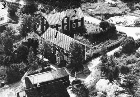 1. Elvi Forsman (f. Kuni) och Oskar Wasbergs gård, 2. Lennart Forsmans och Elna Forsmans (f. Örn) ”gambä stugon” och 3. deras nya vita stuga. Troligen fotograferat på 60-talet för Oskar köpt en vit Volvo 145 år 70 eller 71. Nr 2 (Lennarts) revs 1978. Se VBH III s. 261.