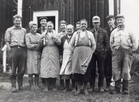 Verner Vestergård (längst till höger) var född 20 september, då det ofta blev potatisupptagning vid Nyback. Här har vännerna Aina Wikman och Irene Hinders, i mitten tillsammans med fru Elsa, mött upp tillsammans med barnen (från vänster till höger i bakre raden:) Bengt (född 1937), Berta (1928), Sven (1924), Gunnel (1926), svärdottern Britta (född Rabb 1939) och hennes man Edvin (1933) och yngstingen Rudolf (1940) på Verners 70-årsdag 1962.