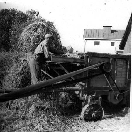Tröskning 1967 vid Nysto, Sanfrid Hinders matar tröskverket. Dragremmen hade svängts för att tröskverket skulle gå rätt väg.