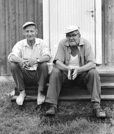 Alfred Lundberg och Tauno Vuorio på trappan vid Lundbergs. Vuorio hade sommarstuga många år nedanför Johannes Wiiks stuga, ner mot den s.k "vatohagan". Gun Örn äger den i dag. De bodde där varje sommar. Frun Elma pratade nästen ingen svenska men umgicks ändå mycket med grannarna. De var ett trevligt par och allmänt omtyckt.