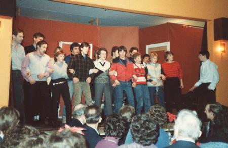 Vann ji jubilaarin, i inledningssången, i främre raden: Erik Berg, Rune Forsman, Hillevi Aura, John Östman, Tryggve Aura, Richard Wik, Nina Aittamäki, Camilla Nabb, Ingrid Beijar och Klas Öman. I Bakre raden: Johan Wasberg, Johnny Friberg, Elisabeth Wik, Håkan Aittamäki, Peter Wasberg och Stig Beijar. Vassorspexet 1985