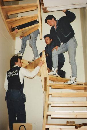 Vindstrappan monteras 1992. Tryggve Aura, Håkan Aittamäki (skymd), Tom Wik och Mikael Frantz. Vassor uf renovering.