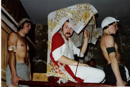 Yngve Östman, Erik Berg och Patrik Aura bakom scen i julfestsketchen Hamlet 1980. Vassorspexet