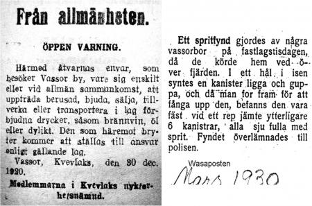 Nykterheten i Vassor är hotad. Det är förbjudet för besökande att uppträda berusad i Vassor enligt en tidningsnotis 1920. Spritfynd 1930