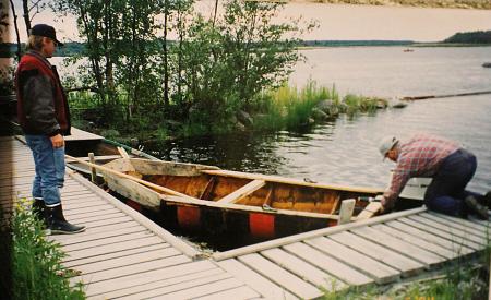 Jan Wasberg och Peter Rådman med båt i Kjell Hinders båthamn. Peter står på bryggan och Jan binder fast båten som var byggd av oljefat. "Världens minsta oljetanker"