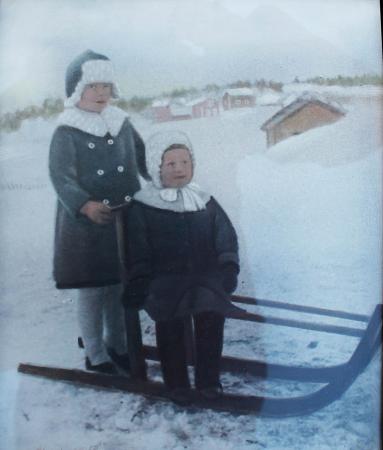 Elvi Kuni g. Wasberg och Aili Kuni g. Herberts på en sparkstötting som deras far Johannes gjort. I bakgrunden husen på skatas. Foto taget från Herrgos. (Härrgos)