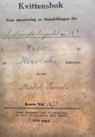 Mickel Smeds bok för avbetalningar för inlösning av torp underSmeds boställe. Senare dottern Vendla Smeds lägenhet. Avbetalningarna började 1.11.1928 enligt de inlösningsvillkor som då trätt i kraft.