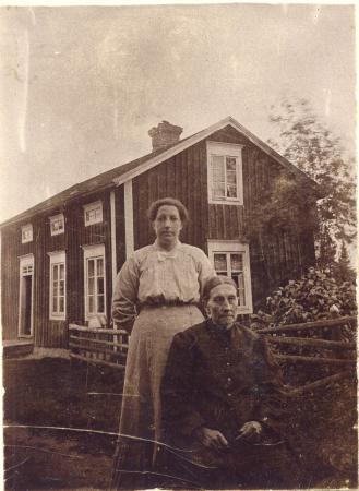 Robert Forsmans mor och mormor: Johanna Matilda Örn f. 1883 och Anna Brita Örn f. Kuni 1854 (Jakopas). Stugan i bakgrunden är Forsmans sytningsstuga eller lillstuga.