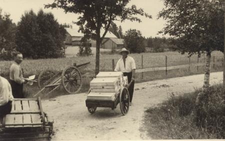 Johannes Kuni t. v. köper upp jordgubbar och Karl Nymark kommer med jorgubbslådor. Utanför ”Skräddaris”, Rune Forsmans gård. Slutet av 40-talet.