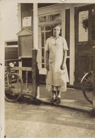 Märta Kuni g. Södergård var i arbete i Johannes Kunis butik och är fotograferad utanför butiken i Kunisundet i slutet av 1930-talet.