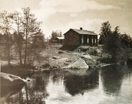 Kunisundet, Såndmossonas stuga på 1940-talet, fotograferad från bron. Camila Forsén-Ström och Robert Ström bor i stugan 2021. BIlden finns i "Svenska Finlands bygd och folk" 1949.