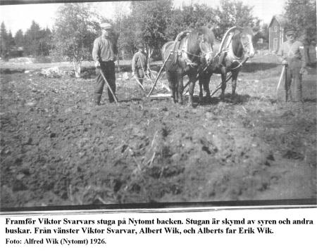 Viktor Svarvar och Albert Wik plöjer på Nytomt. Alberts far Erik Wik till höger. Viktor och Ida Svarvars stuga i bakgrunden.